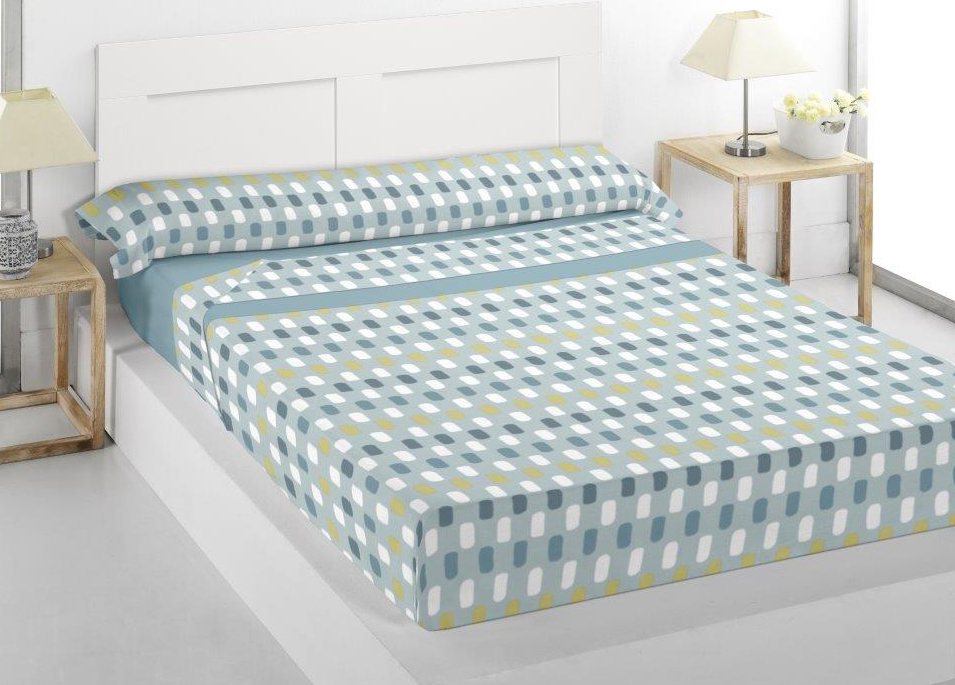 Juego de sábanas con dibujo geométrico estampado. Confeccionado con un tejido de microfibra de poliéster con un gramaje de 220 gr/m2 y perchado a dos caras, el resultando es un tejido extremadamente cálido y muy suave al tacto, ideal para el invierno.